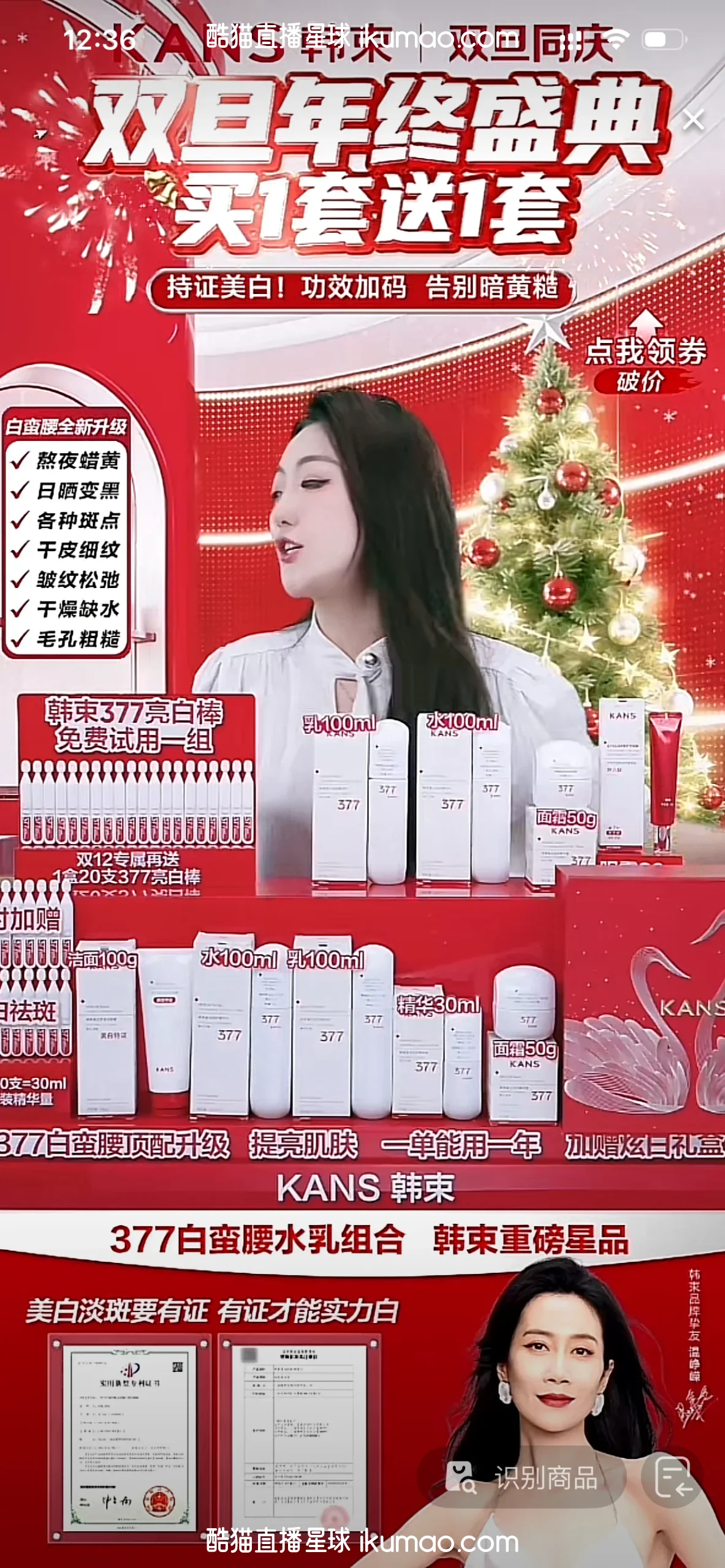 配色采用红色为主,搭配白色产品包装与金色装饰,形成对比,增强视觉冲击;布局分为标题区(大字体活动标语)、主播区(人物与圣诞树背景)、产品展示区(分层陈列水乳、面霜等)、证书区(背书信息),层次清晰;视觉焦点通过大标题“双旦年终盛典 买1套送1套”与产品排列形成,字体粗体醒目,信息传递高效;圣诞元素(圣诞树、红色装饰)与促销标语(“持证美白 功效加码”)结合,强化节日与信任感
