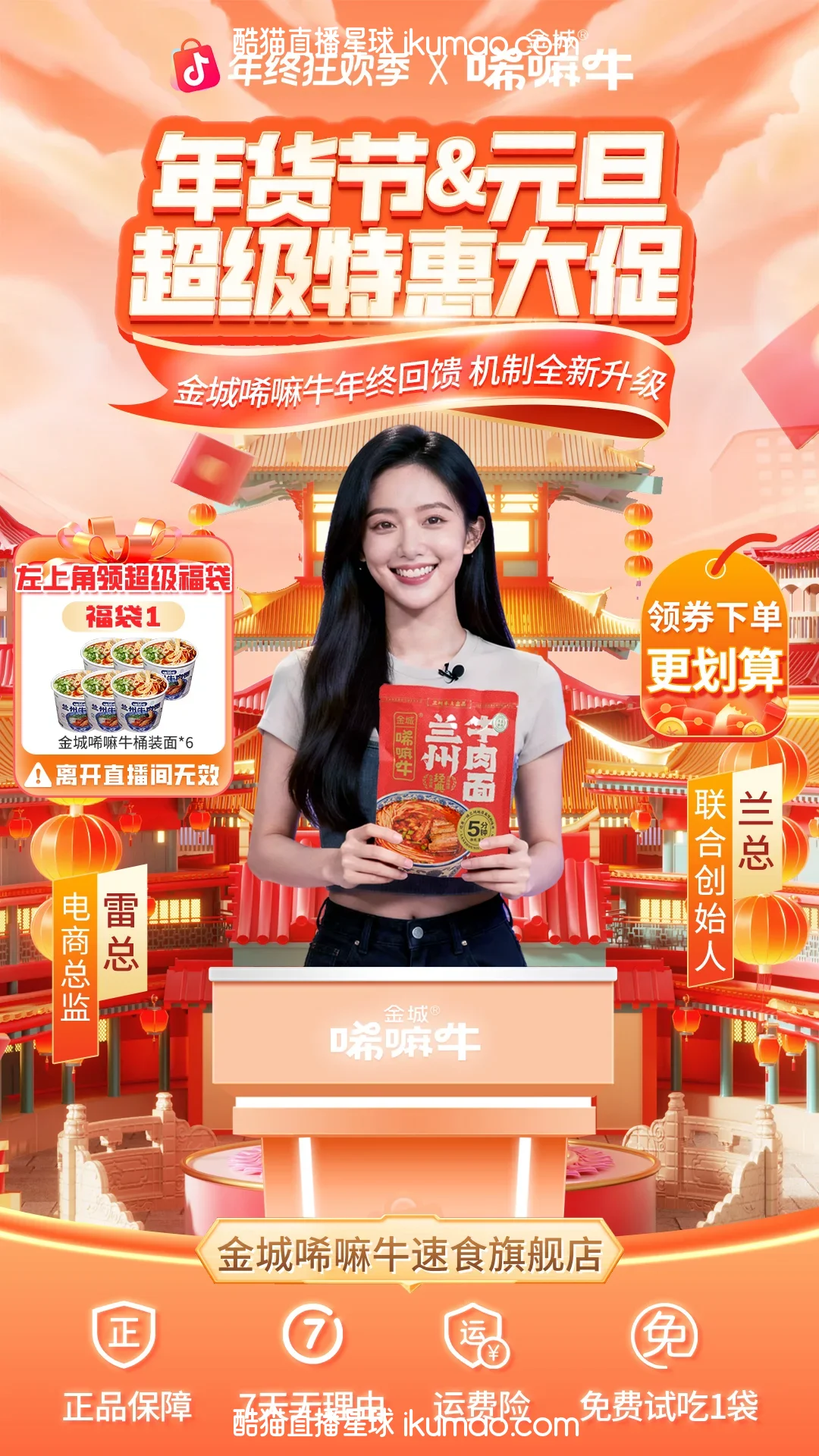适合餐饮行业(速食面)的电商直播,尤其适用于年货节、元旦等节日的促销活动,能有效吸引目标用户注意力,提升转化率