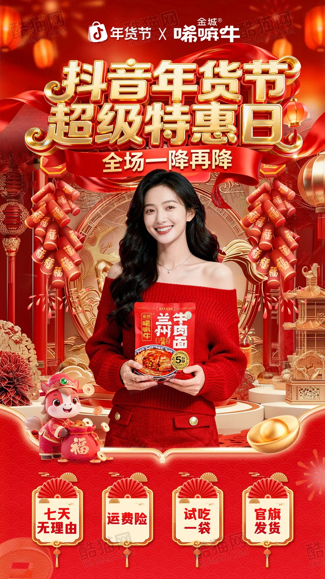 给大家分享的这个这张直播图采用新年红色主题,融合春节元素(马,灯笼、鞭炮、福字),搭配主播与产品展示,整体风格喜庆热闹,适合食品行业在抖音年货节期间的电商直播促销场景。也可用于其他行业需要营造节日氛围的直播背景设计。