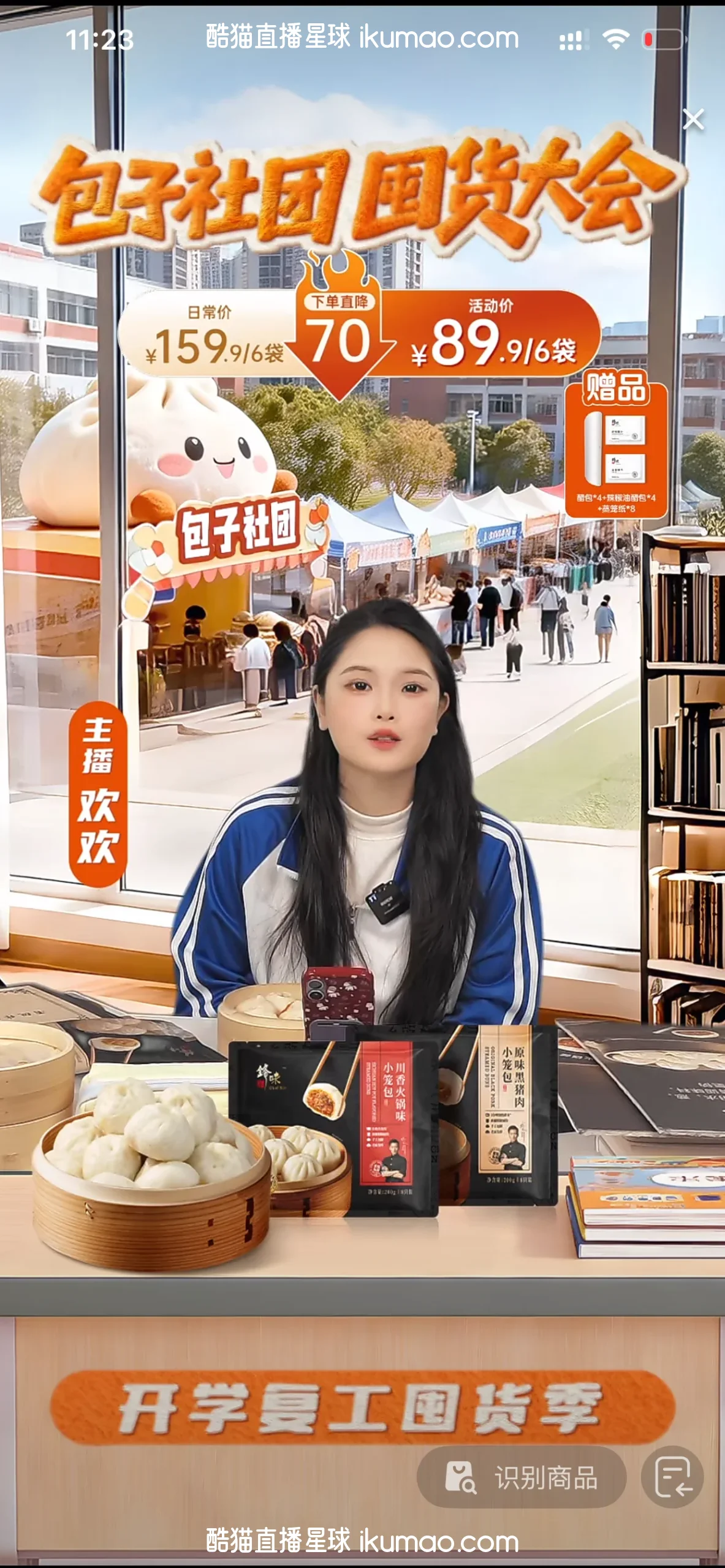 这个直播间的背景太有画面感了,像把校园市集搬进了屏幕里,包子社团的卡通形象和后面的帐篷、人群,瞬间就有代入感。