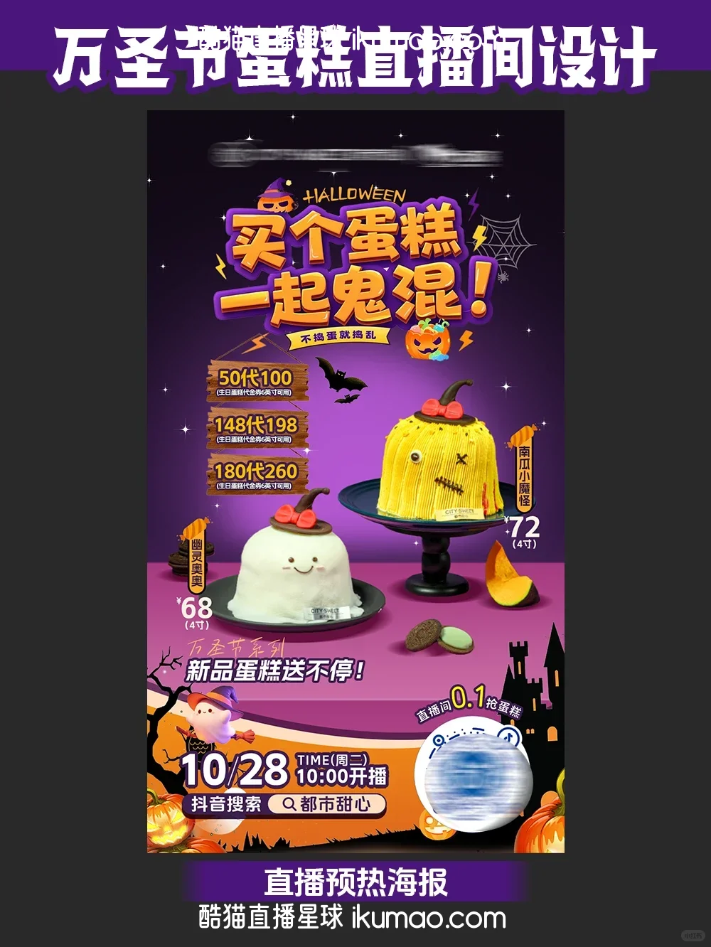 这张万圣节蛋糕直播间的图直接戳中我,紫色渐变背景配南瓜、蝙蝠这些元素,把节日氛围拉满了,蛋糕的卡通造型也超可爱,一看就让人想点进去